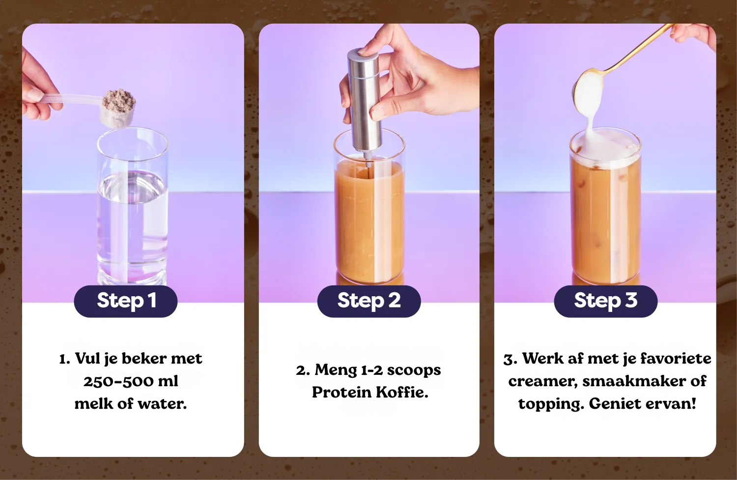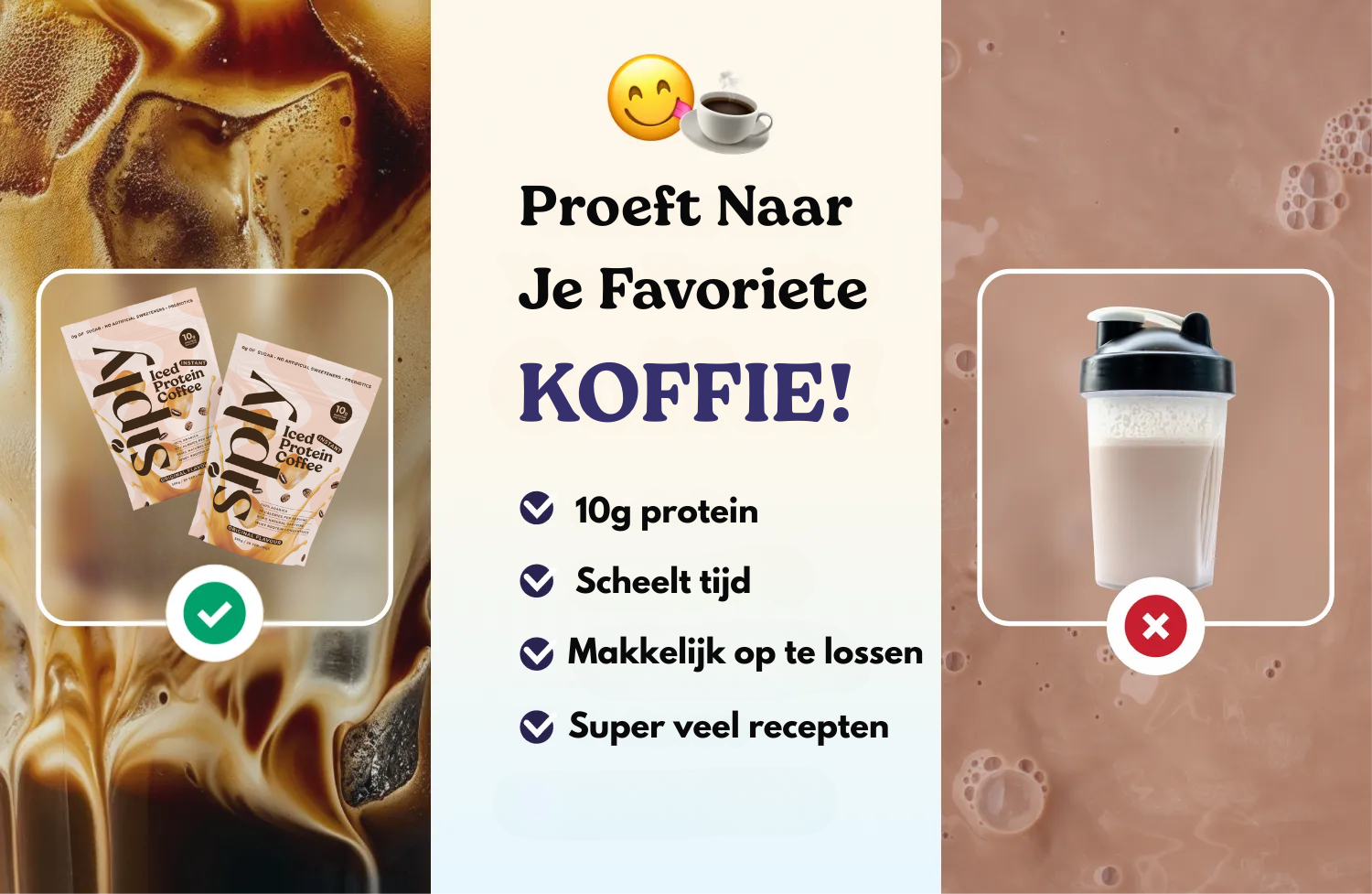 Onze Proteïne Koffie is een snel te bereiden koffie met extra proteïne! De perfecte mix om je te helpen gezonder te worden, af te vallen en je fitnessdoelen te bereiken. We gebruiken de allerbeste instantkoffie die er bestaat en combineren die met ultrazuiver wei-eiwit via ons unieke mengproces. Het resultaat? Pure magie. ✨